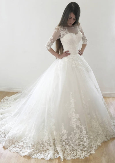 Illusion Long Sleeve Court Lace Ball Gown Bridal Wedding Dress